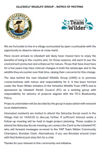 If sufficient interest exists a follow-up meeting will be held to begin project planning. Those unable to attend the Saturday Social meeting can contact the Clerk to the Ulleskelf PC who will forward messages received to the YWT Team Wilder Community Champion, Brendan Clark. Alternatively, if you see Brendan around (man with Red Setters) just stop him for a chat.